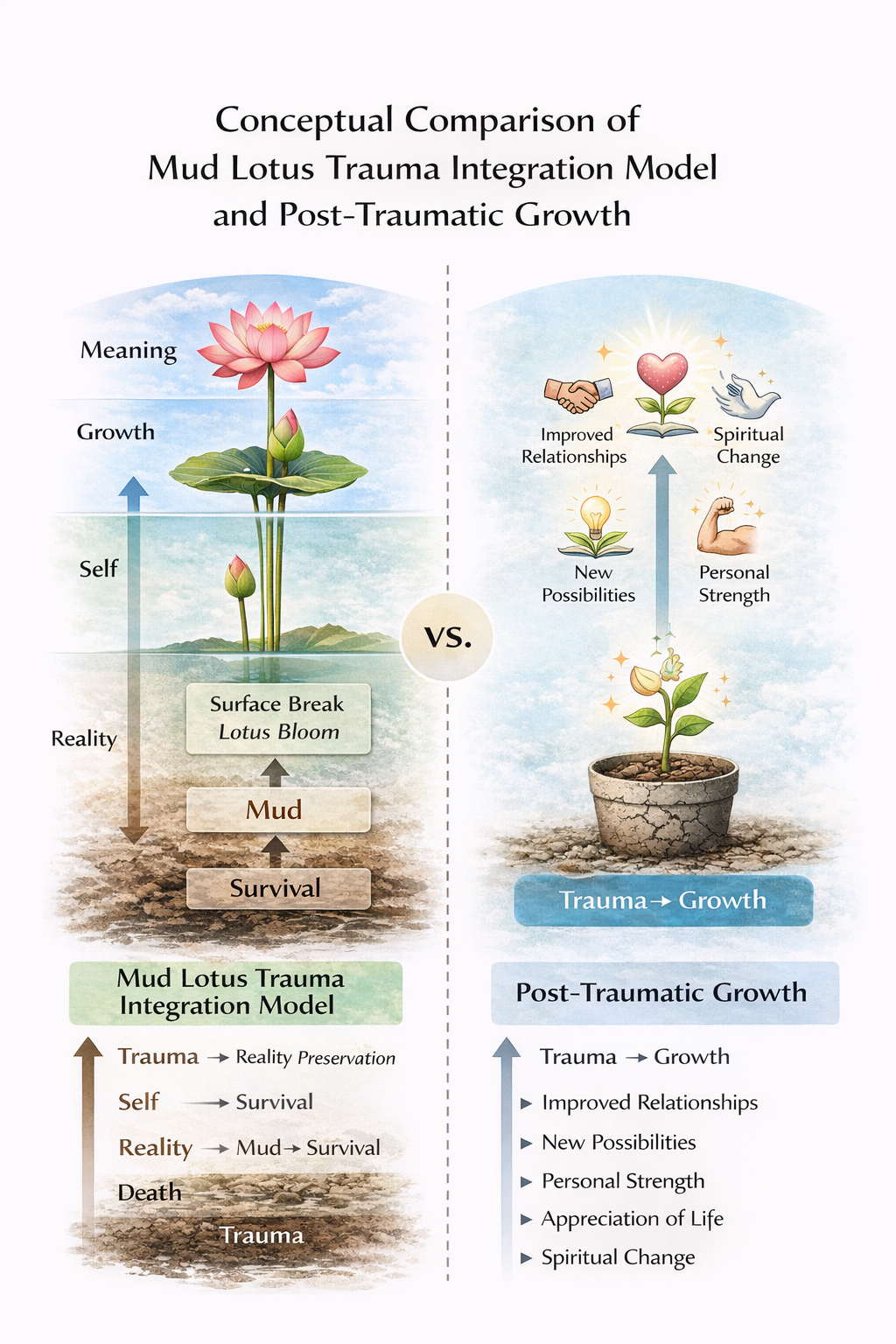 The Mud Lotus Model extends beyond the widely recognized Post-Traumatic Growth framework by conceptualizing recovery not only as growth but as a process involving reality preservation, restoration of being, and transcendent meaning integration. Drawing on insights from trauma psychology, Eastern philosophy, and clinical practice, the model offers an integrative perspective on trauma recovery.