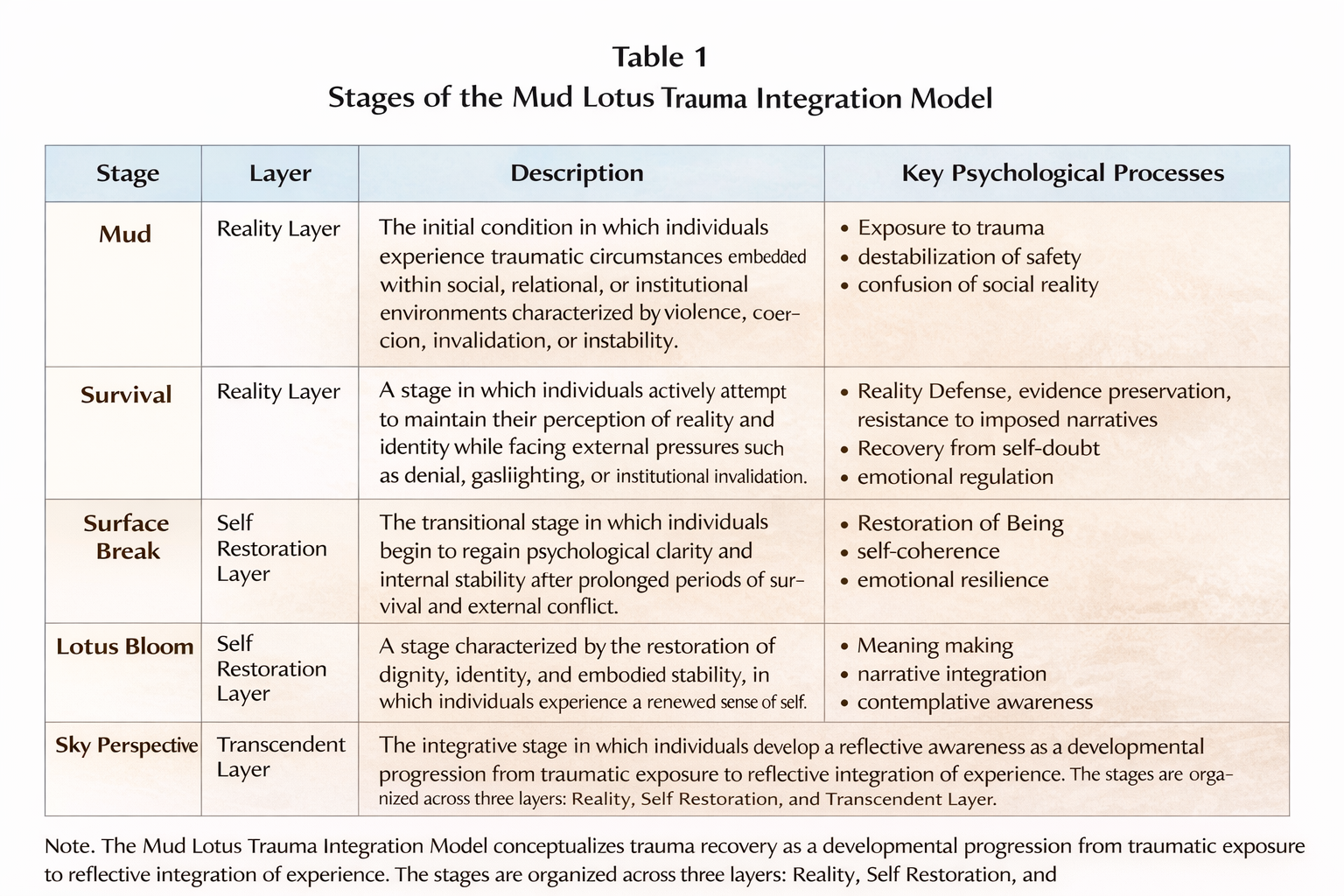 By incorporating social reality, existential recovery, and contemplative awareness, the model expands trauma theory beyond symptom reduction and post-traumatic growth. The Mud Lotus Trauma Integration Model contributes to trauma theory by integrating social reality, existential recovery, and reflective awareness within a unified framework of trauma integration.